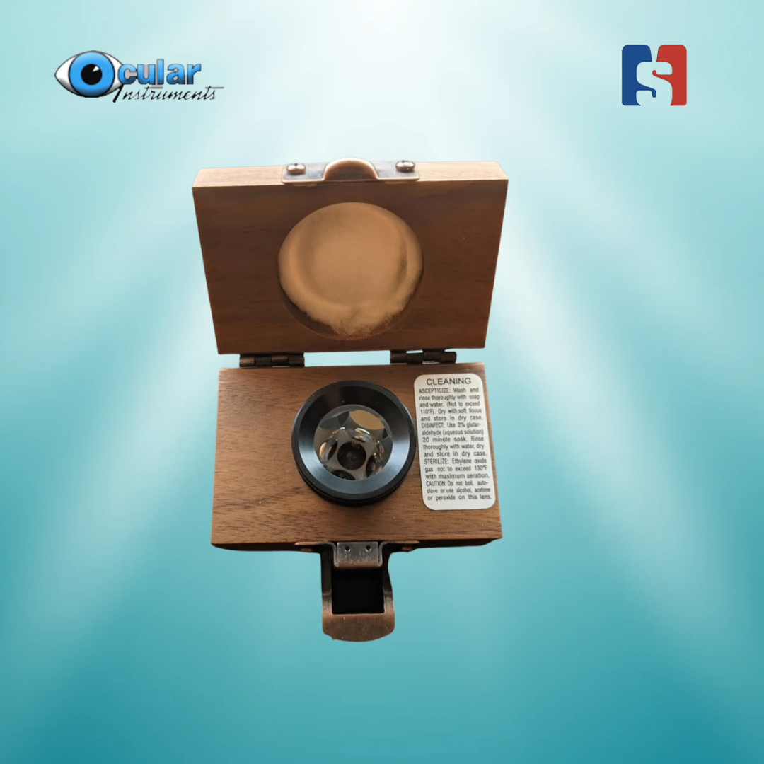 The Ocular USA 4-Mirror Sussman Gonioscope is a handheld, no-flange lens designed for comprehensive anterior chamber angle examination. Its four 64° mirrors provide a complete 360° view with minimal rotation, eliminating the need for coupling fluids and enhancing patient comfort. The 9mm contact diameter allows for easy manipulation, including compression gonioscopy, and is suitable for narrow palpebral fissures. High-quality optics deliver clear, magnified views of angle structures for accurate glaucoma diagnosis and management. The Sussman lens is durable, easy to disinfect, and even allows for central posterior pole viewing. Available with different colored holding rings and an optional larger ring, it’s a versatile tool for any ophthalmic practice.