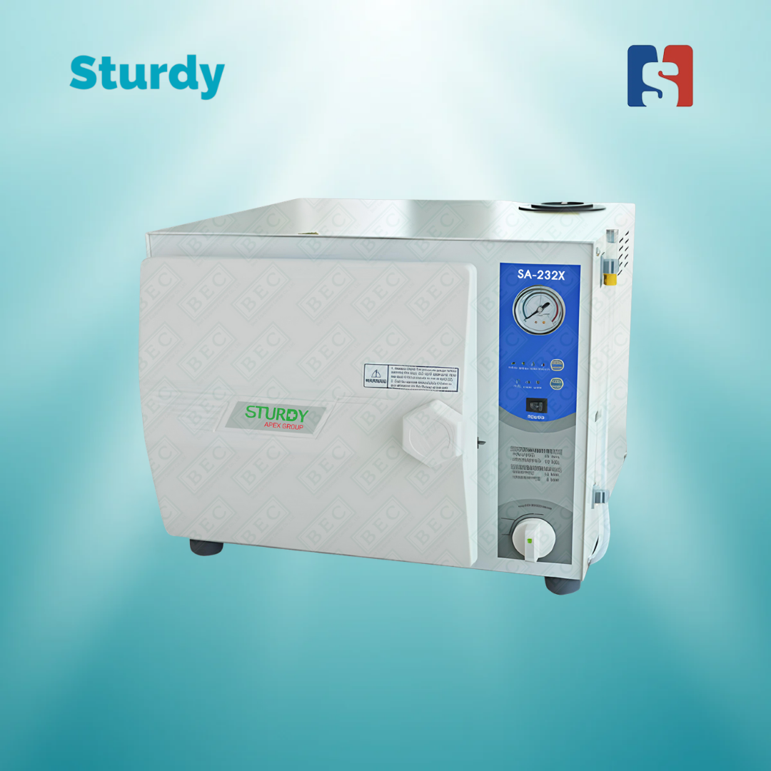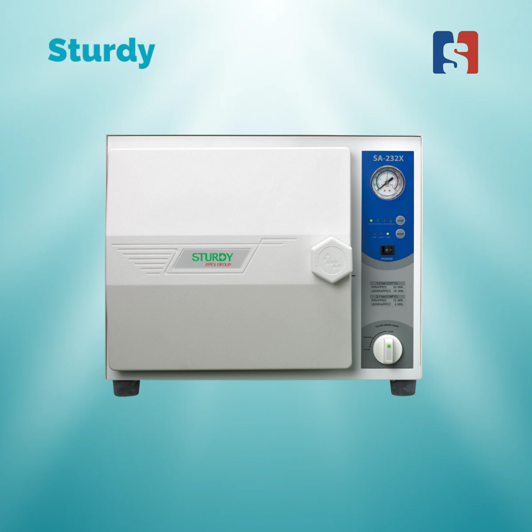 The Sturdy SA-232X flash autoclave, manufactured in Taiwan, is designed for ultra-rapid sterilization of critical medical and dental instruments. This compact and user-friendly unit utilizes high-temperature steam under pressure to achieve sterilization cycles in a significantly reduced timeframe compared to traditional autoclaves. Its fast operation makes it ideal for situations requiring immediate instrument reprocessing between patients or procedures, enhancing workflow efficiency and minimizing downtime.